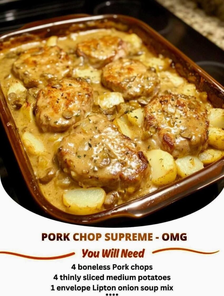 Pork Chop Supreme is a classic comfort dish featuring tender pork chops smothered in a creamy mushroom sauce, often baked or simmered until juicy and flavorful. It’s hearty, rich, and perfect for a cozy meal.